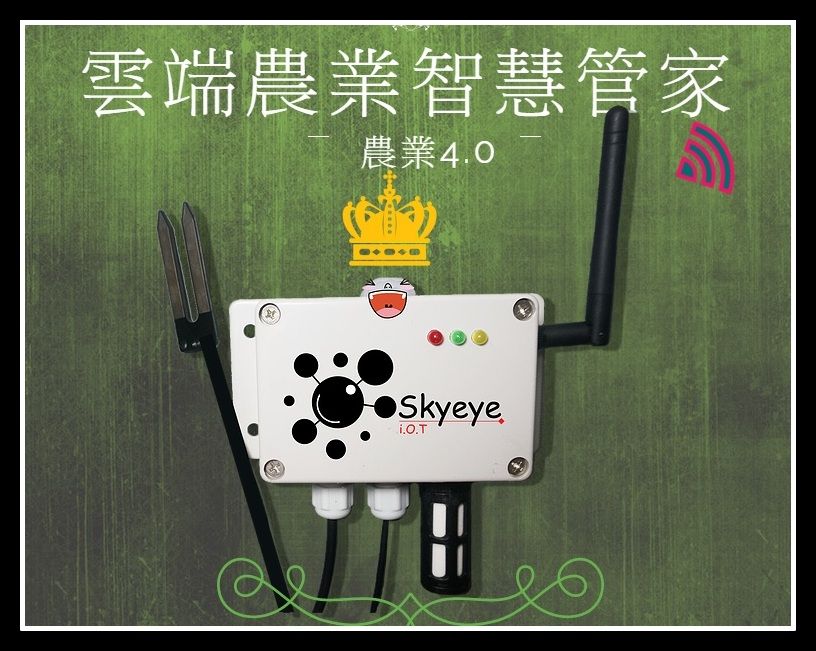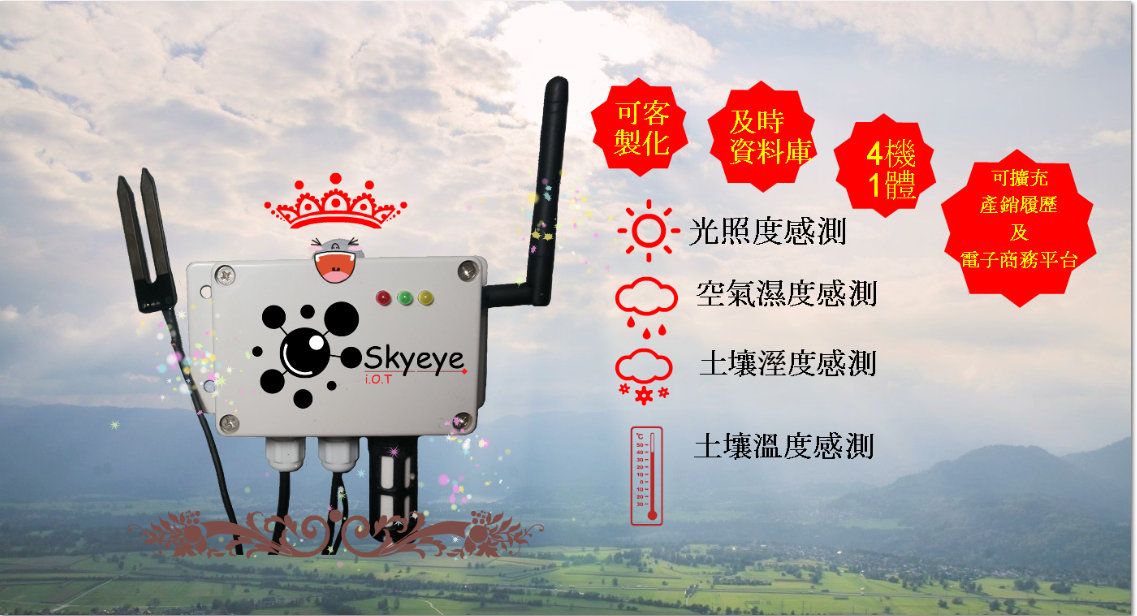 5合1的『Skyeye雲端智慧農業管家』系統 只需一顆手掌大小的 Skyeye,您即可同時監看: 光照度感測、空氣溫度感測、空氣溼度感測、土壤溫溫度感測、及土壤濕度感測五個感測器數值! 當然,我們也可客製您所需要的感測器 ! 之後,您可選擇於電腦營幕上監測或下載APP於手機隨身看! 【Skyeye智慧農業管家】帶您直接升級農業4.0。 24小時監控、自動記錄各項參數、依作物最佳生長參數主動進行農場環境調整、全中文與圖形化操作介面、提供生產運銷等大數據分析,歡迎洽詢!